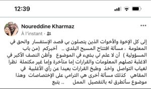 حيت كتب خرماز عبر حسابه الرسمي مخاطبا كل المتتبعين لحسابه والمتصلين به قصد الإستفسار عن صحة خبر إنقسام اغلبية المكتب المسير وعن معطيات صحيحة تخص فتح المسبح الجماعي في وجه العموم،