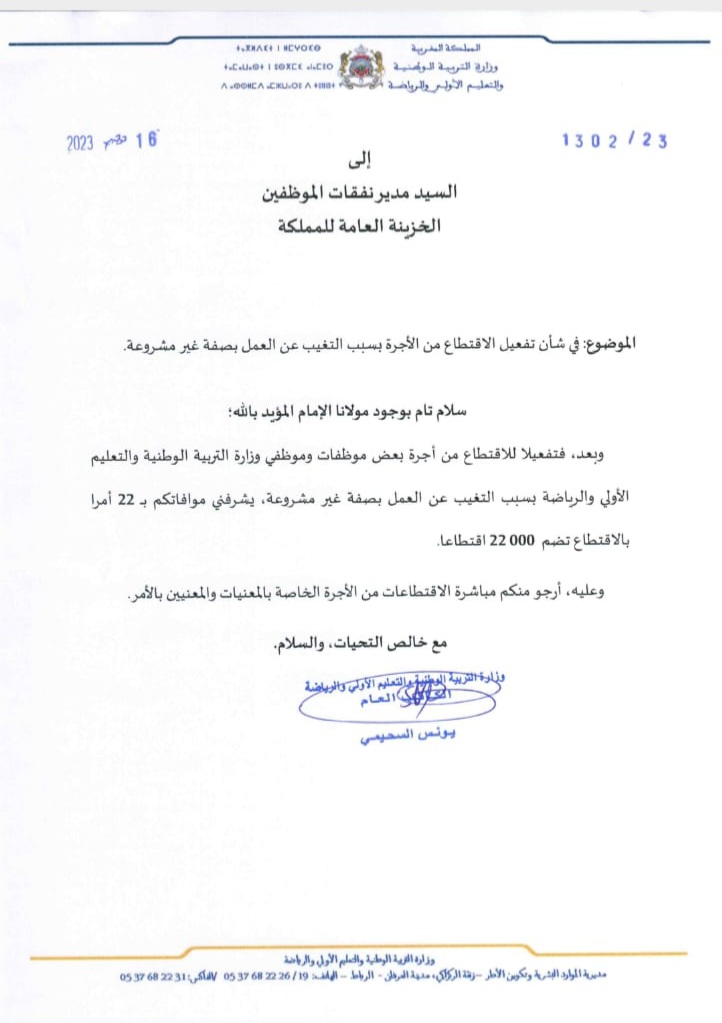 وما المبتغى من تسريب وتيقة إدارية صادرة عن وزارة التربية الوطنية والتعليم الأولي والرياضة تأمر الخازن العام للمملكة بتنفيذ 22 أمرا بالإقتطاع من أجور بعض الأساتذة المضربين عن العمل الذي يصل عددهم 22000 أستاذ وأستاذة حسب ذات الوتيقة المسربة